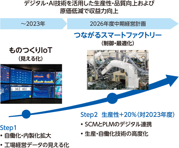 「つながるスマートファクトリー」の構築では、今までのものつくりIoTによる見える化・自働化の取り組みに加え、SCM・PLM情報のデジタル連携による開発効率向上、AI技術を駆使した生産・自働化技術の高度化による製造現場の稼働率向上および自働化適用範囲の拡大などにより、更なる生産性向上(対2023年度20%改善)・原価低減・品質向上を目指します。