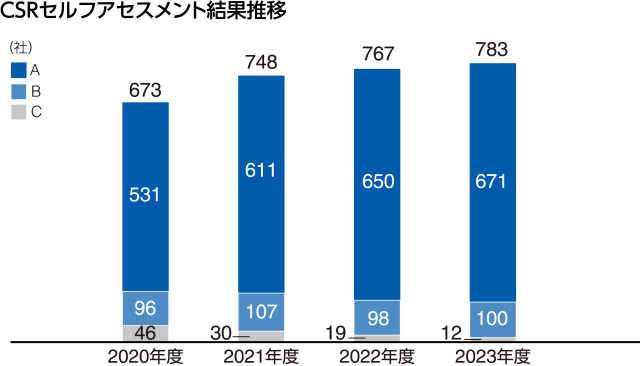 お取引先様のCSRに関する取り組み状況を把握するため、毎年CSRセルフアセスメントを実施しています。またお取引先様向けCSR説明会や面談を通じて当社とお取引先様の課題の共有と改善活動を協働で実施するPDCAを回しています。2023年度は直近3年間の購入額の上位80%を構成するお取引先様783社に対してアセスメントを実施しました。活動の効果としてランクAのお取引先様が年々増加しています。2024年度は883社を予定しており、課題の共有と協働改善を通じてサプライチェーンにおけるCSRの浸透と強化を推進していきます。