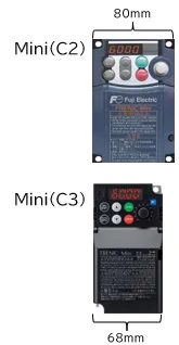 自社の高効率なパワー半導体の搭載や放熱性を高めた回路設計により、従来製品(FRENIC-Mini(C2))と比較して約15%の小型化(横幅寸法の短縮)を実現しました。