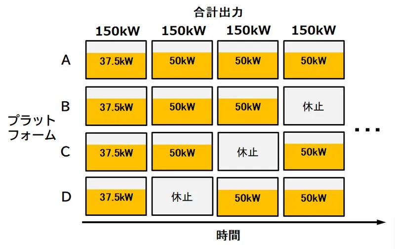 150kWの出力であれば、まず4台のプラットフォームを37.5kWで動かす。一定時間が経過したら、プラットフォームA、B、Cを50kWで稼働させ、その間にプラットフォームDを休止させる。その次は、Dを稼働させてCを休ませる。こうした制御により合計150kWの出力を維持するというシステムだ。
