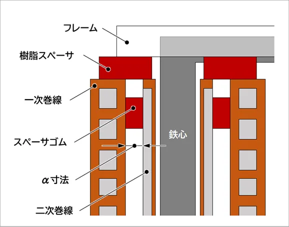 モルトラは、一次巻線と二次巻線の間に「スペーサゴム」という部材を挟みこんで「α寸法」と呼ばれる空間をつくり、絶縁効果と冷却効果を併せ持つ構造になっている。