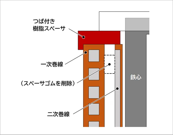 たどり着いたのが、「つば付きスペーサ」だった。2つの巻線を縦方向で保持している樹脂スペーサに「つば」を設けて一次巻線を横方向にも固定することで、スペーサゴムがなくてもα寸法を維持できるようにした。