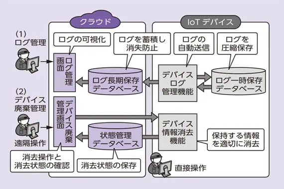 IoTシステムを安全かつ効率的に運用するためには、IoTデバイスを製造から廃棄に至るまで適切に管理することが必要である。このライフサイクル管理の仕組み構築に向けて、これまで開発してきたIoTデバイスの通信設定自動化、死活監視、システム更新などの機能に加えて、今回、ログ管理とデバイス廃棄管理の機能を開発した。ログ管理は、IoTデバイスのログを圧縮保存しクラウドに送信・蓄積してログの消失を防止する機能で、ログの自動収集と可視化により異常発生時の迅速な対応と現場作業員の負担軽減を可能とする。デバイス廃棄管理は、遠隔または直接操作によりIoTデバイスが保持する情報の適切な消去と消去状態の確認を行う機能で、データ消去の一元化により情報漏えいの防止と消去作業の効率化を実現した。