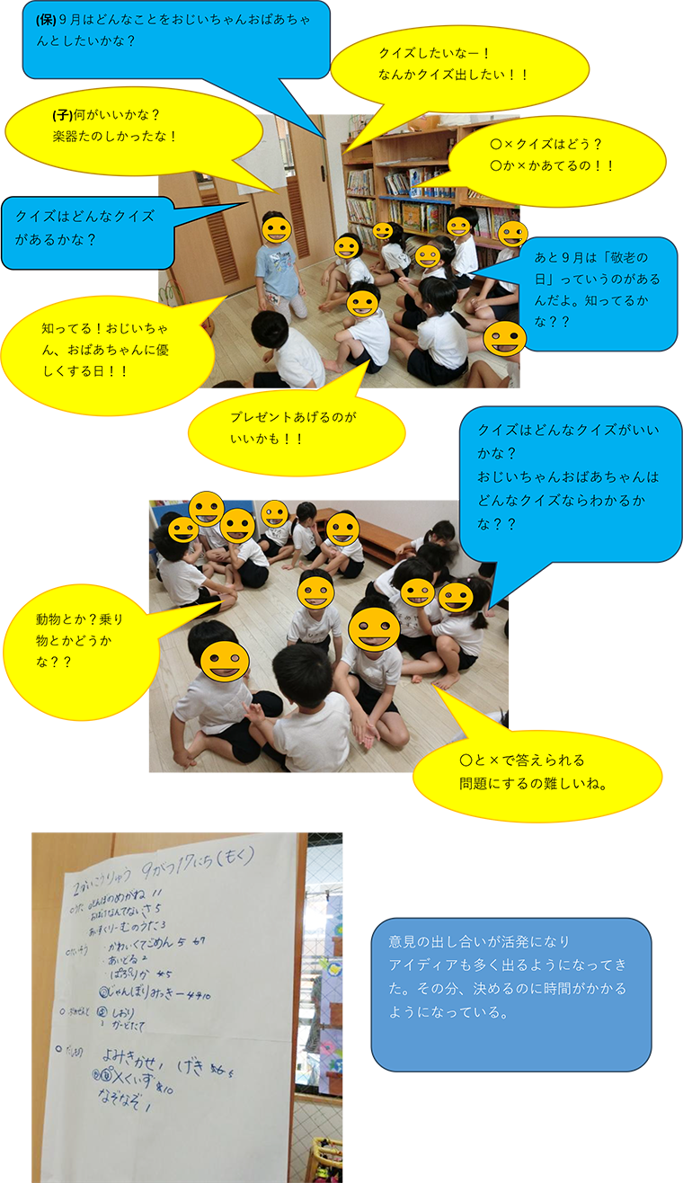 敬老の日というテーマもあったので話し合いはスムーズに進んだ。アイディアがいろいろと出てきて「それもいいね」と他児の意見に賛同する姿が見られたが、どれかに決めるときに時間がかかり、なかなか決まらなかった。しかし、多数決にする意見が出たことで、他児の賛同がありきまった。