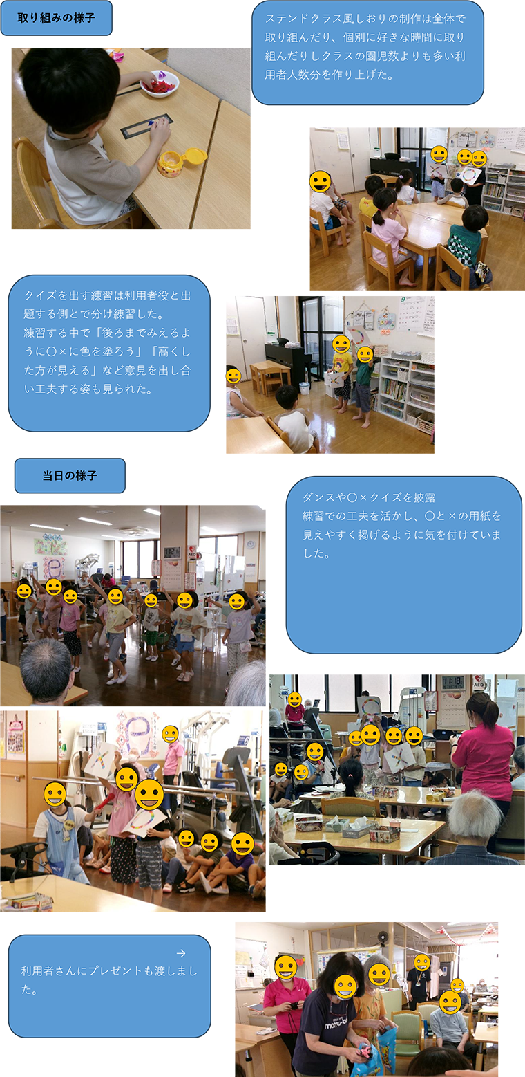 その分意見をまとめるのに保育者が助言したり、仲立ちするのは必要だが、「じゃんけんで決めよう」「多数決にしよう」など決め方についても子ども達から意見が出て解決できる姿があった。これもいままで保育者が助言していたことを覚えており、以前決めた方法を自ら考え取り入れていると考えられ今までの活動がつながっていると感じた。おじいちゃんおばあちゃんを想像し「どうしたらわかりやすいか」「後ろまで見えるようにどう工夫するか」なども考え意見として出し会えていた。話し合いから交流会での実践までイメージができるようになっていることも感じた。