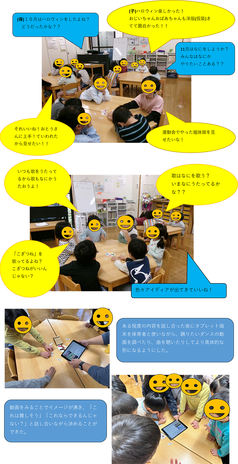 運動会終了後から交流の日まで期間が短く、様々なアイディアが出たが保育者が「新しいことを覚えたり練習するには時間が足りないかもしれないね」とは話すと「だったら運動会でやったこと披露したいね!」と数人が話だした。さらに季節の歌や運動会の歌、運動会で踊ったダンスや準備体操など運動会をきっかけにたくさんのアイディアがでた。アイディアが多くまとめるのが大変だったので、それらの意見を取り入れらられるように保育者がまとめ「ミニ運動会」として提案すると子ども達から「じゃあ運動会ならはじめのことばやおわりのことばも言ったから言おうよ!!」と意見が出て周りの子も「いいね」「それやろう」と賛同し内容が決まった。