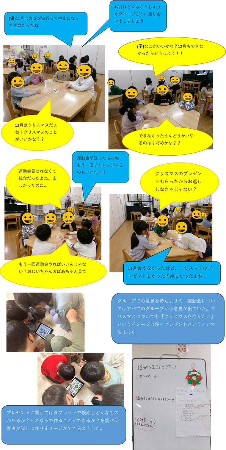 先月の交流会で披露するはずだったミニ運動会をしたいということで今月は先月予定していたミニ運動会を行うことにした。意見の中では「11月に決めた内容をそのままやるのでいい」という意見もあったが、クリスマスが近いことや前回の交流会はできなかったがおじいちゃんおばあちゃんからクリスマスプレゼントをもらっていたという話からクリスマスをテーマに盛り込むこととなり、クリスマスの歌「あわてんぼうのサンタクロース」を歌うことと、プレゼントのお返しにクリスマスリースを作って渡すことになった。クリスマスプレゼントはタブレットを使い自ら作れそうなプレゼントを検索し、折り紙で作れるものを見つけみんなの意見が一致して決めることができた。