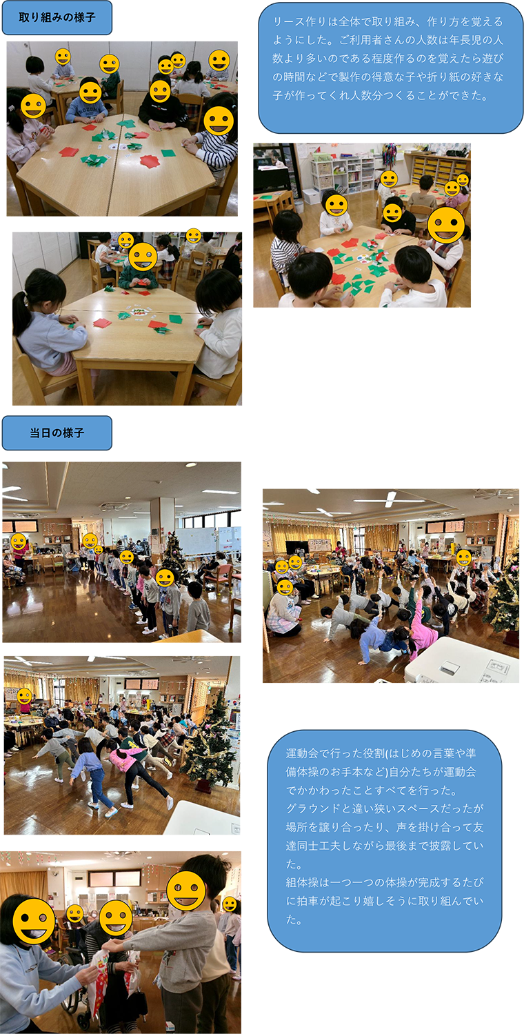 「①はじめの言葉 ②ガンバリマンのうた ③準備体操“僕らのうんどうかい” ④組体操 ⑤おわりの言葉」 - 手作りのクリスマスプレゼントを渡す(折り紙で作ったクリスマスリース)