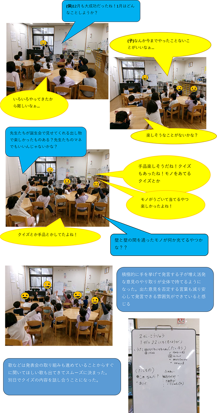 - 歌は発表会に向けて練習している「ともだちになるために」と季節の歌「こぎつね」を歌いたいと意見がったのできめた。