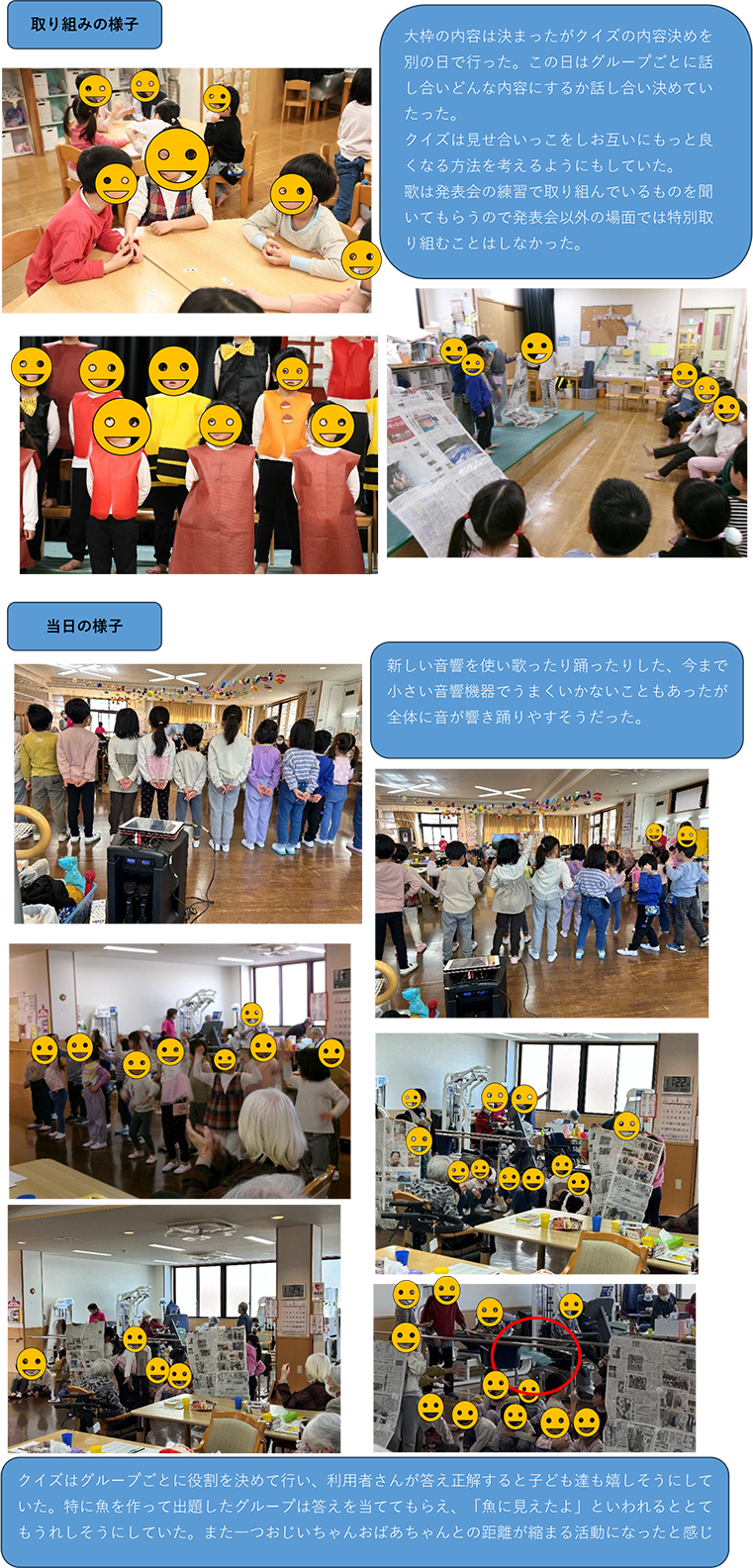 歌は発表会に向けて練習している歌だったので発表会前に大勢いの人の前で歌えたことは自信と意欲につながっていた。 -