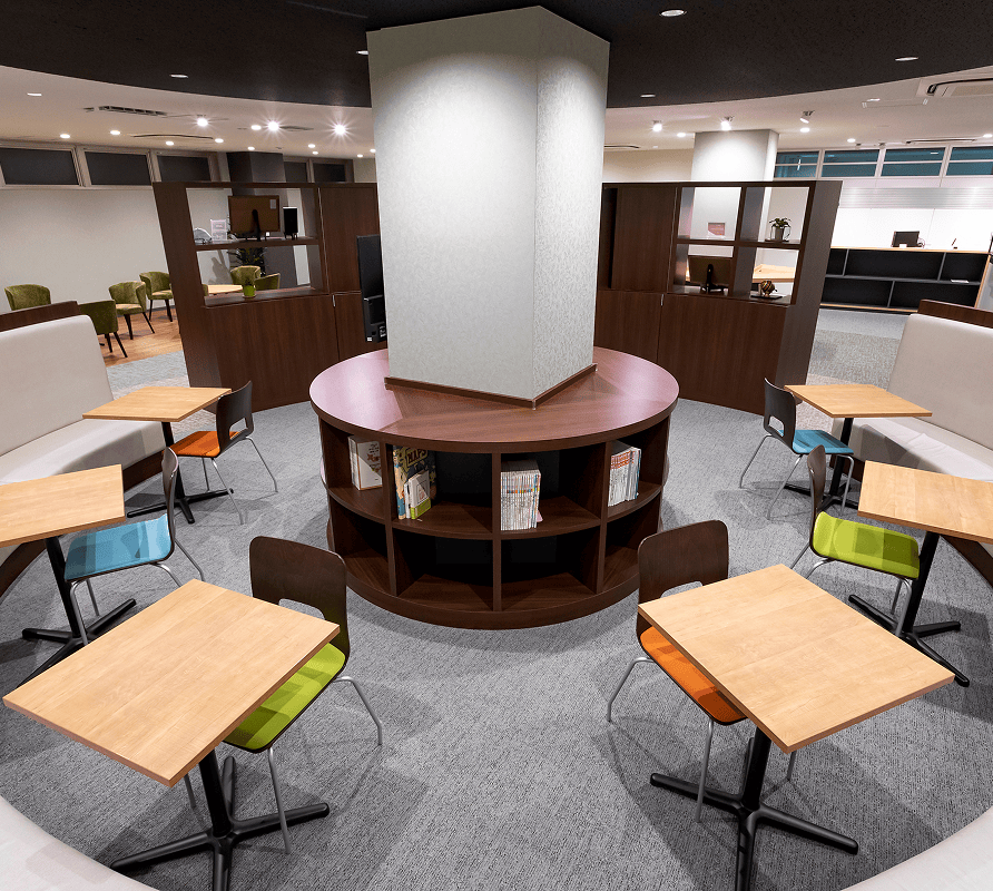 オンとオフを緩やかに切り替えて、上手に気分転換。お菓子やドリンクで一息つきながら、気軽な雑談や休憩ができる場です。