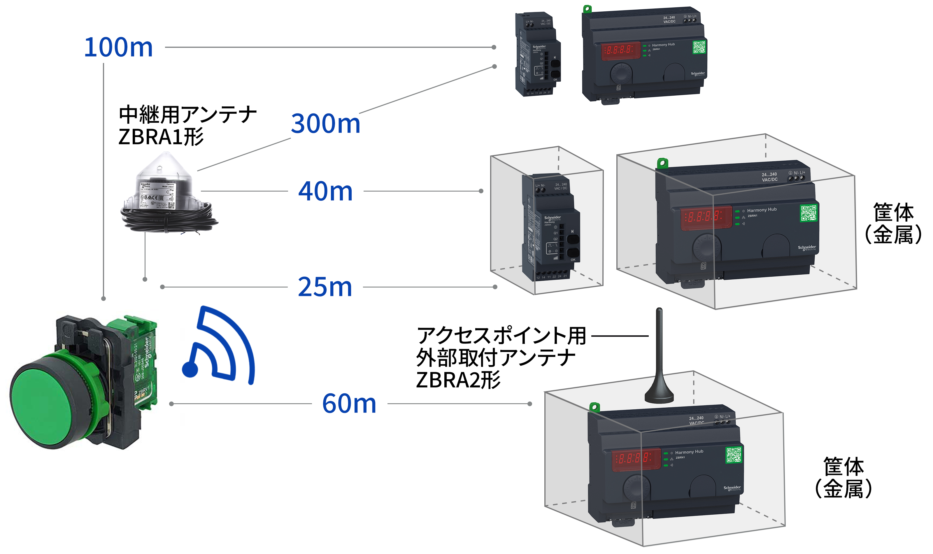 送信の妨げになる障害物を迂回し、あるいは到達距離を拡大するために中継用アンテナ(ZBRA1)も使用可能。