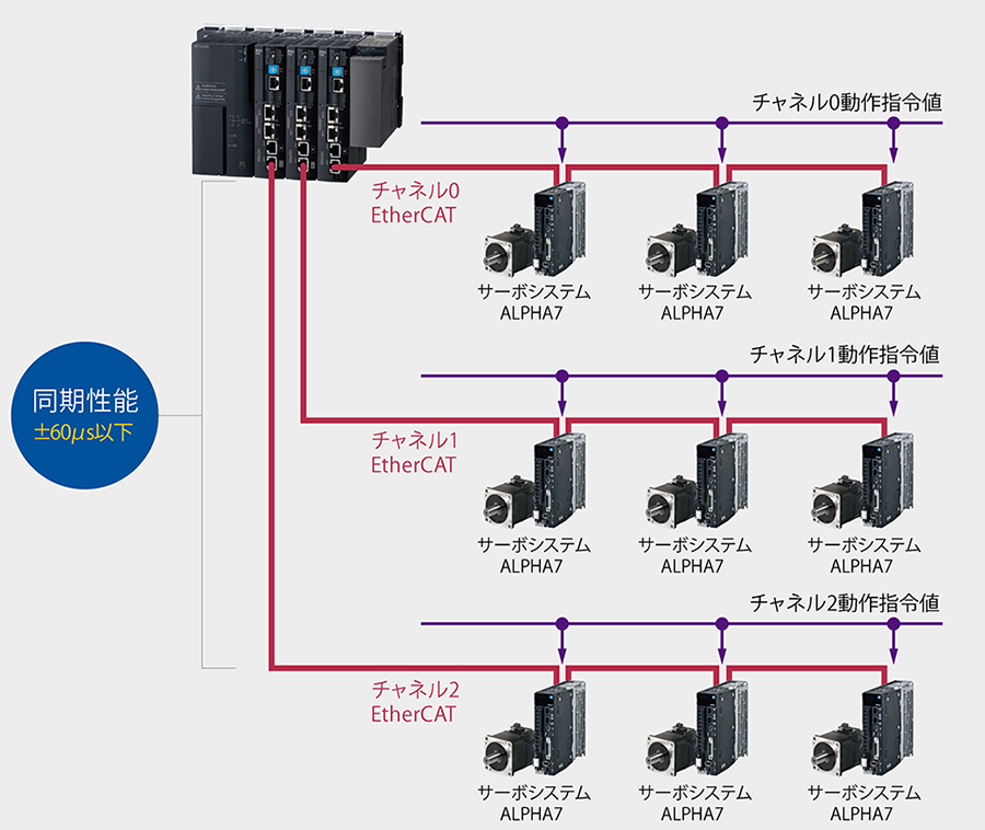 EtherCATのチャネル間データ出力タイミングが同期します。