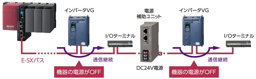 電源が未投入の機器があっても電源補助ユニットにより、通信を継続します。
