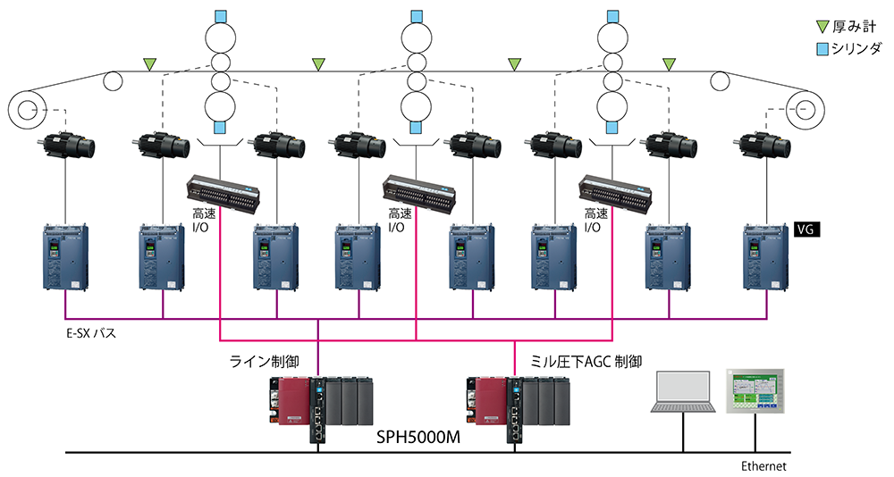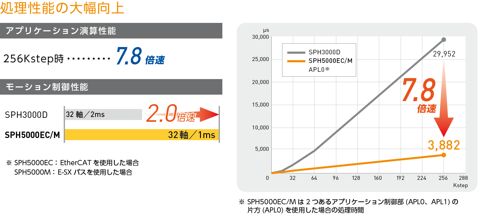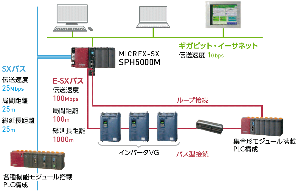 SPH5000M は、汎用ネットワークとしてギガビット・イーサネット(1000BASE-T)、フィールドバスとして、E-SX バス・SX バスに対応しています。超高速で高精度なE-SX バスに対応することで、大規模かつ信頼性の高い設備・機械制御を実現できます。