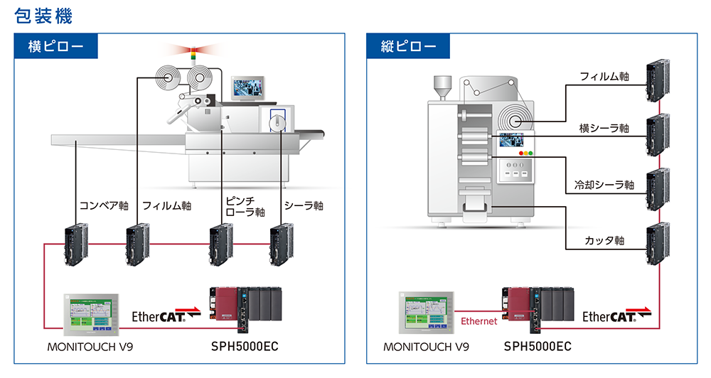 SPH5000EC は、汎用ネットワークとしてギガビット・イーサネット(1000BASE-T)、フィールドバスとして、EtherCAT・SX バスに対応しています。EtherCAT 対応により、様々なフィールド機器がつながるオープンな高速・高精度モーションシステムが構築可能です。