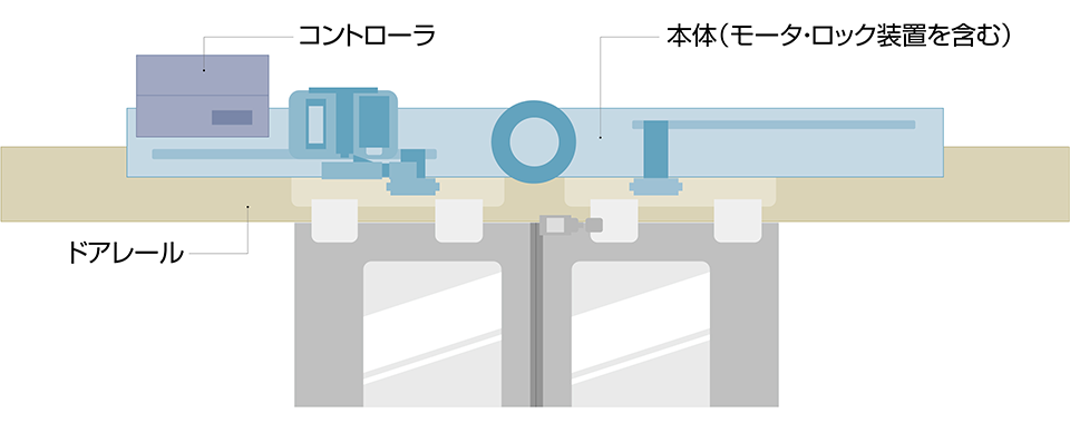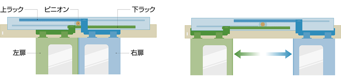 モータ(ピニオン)の回転により、ラックが左右に動作。上下のラックと左右の扉を締結することにより開閉を⾏います。