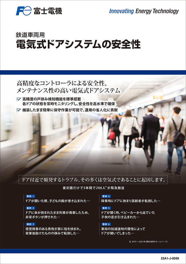富⼠電機の鉄道車両⽤電気式ドアシステムは、独⾃の⼾挟み検知機能を搭載。ドアの挟み込みを⾼精度で検知し乗客の安全を守るとともに、乗務員の負担を軽減。⾃動運転における安全の担保にも⼤きく貢献します。