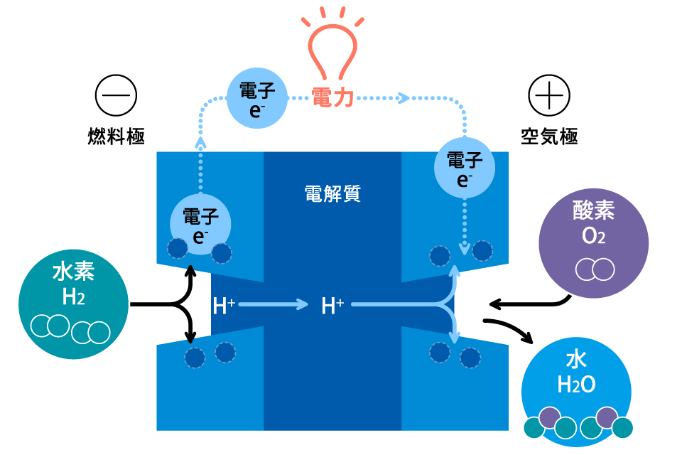 燃料電池は、水の電気分解の逆のプロセスを利用した装置です。水素と酸素の化学反応によって水を生成すると同時に、その過程で発生する電気を取り出します。
