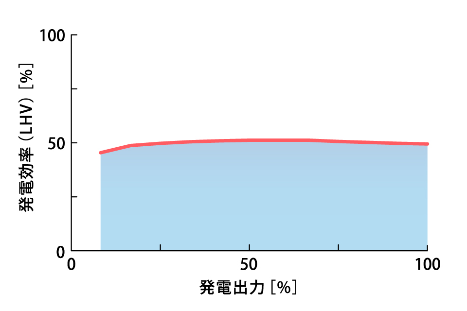さらに、燃料電池は水素燃料が持つエネルギーを熱や動力を介さず直接電気へと変換する仕組みを採用しているため、幅広い発電出力範囲(8%~100%)において、安定して高い発電効率を実現できます。この特性により、燃料電池は低出力から高出力まで効率よく運転することが可能であり、さまざまな利用環境に対応できます。