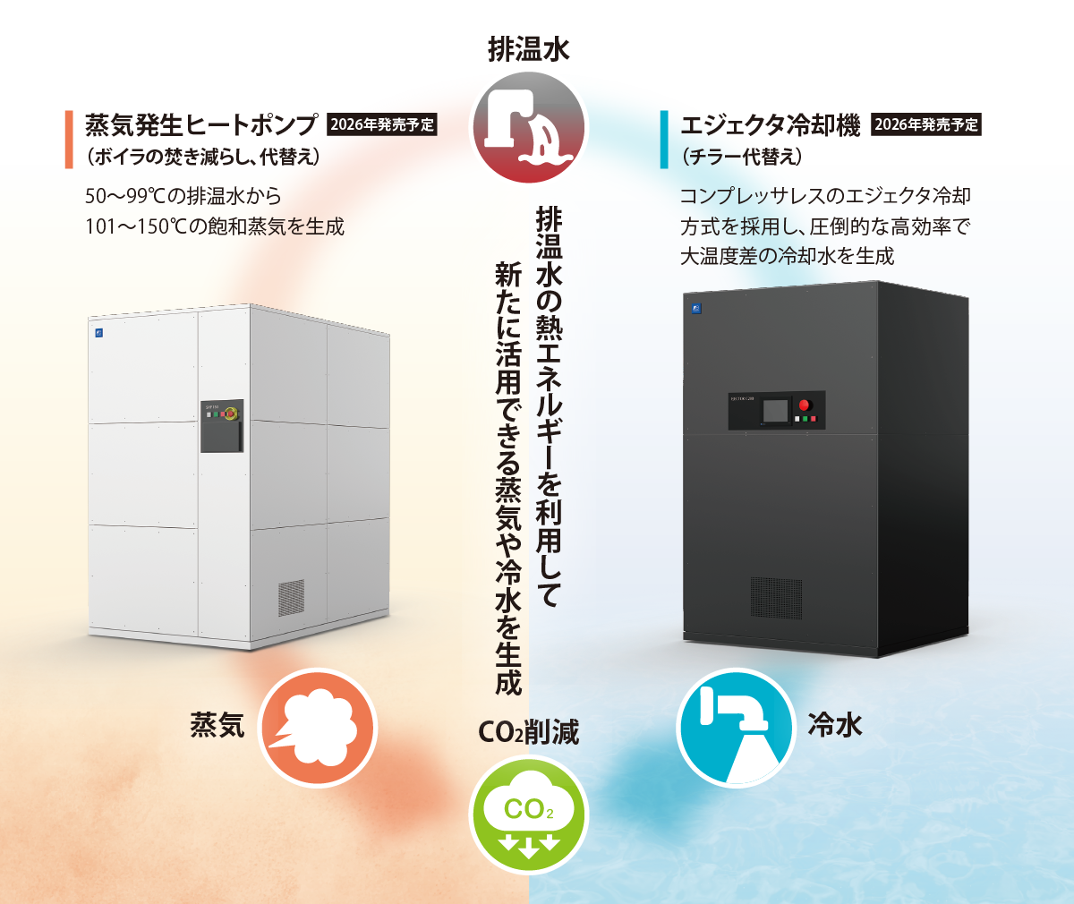 従来活用が難しかった40℃以上の排温水の熱エネルギーを利用し、大温度差の冷却水を生成