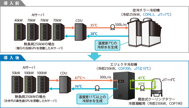 また、従来の冷却方式では活用が難しかった40℃〜の排温水の熱エネルギーを回収・再利用して冷却が可能となり。かつ大温度差 (△T≥10) の冷却を実現します。
