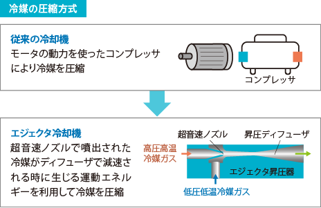 エジェクタ冷却機は、冷媒コンプレッサの代わりにエジェクタ昇圧器を採用した冷却機です。 モーターを動力とするコンプレッサレスの構造で、冷媒の圧縮に電気的なエネルギーを使用しないため、電力消費を飛躍的に削減できる特長があります。