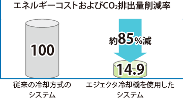 エジェクタ冷却機はコンプレッサレスの構造で、冷媒の圧縮に電気的なエネルギーを使用しないため、電力消費を大幅に削減できる特長があります。