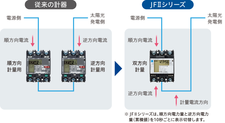 順方向はもちろん、逆方向の電力量も表示できるので、太陽光などの発電システムにおける取引証明用として使用可能