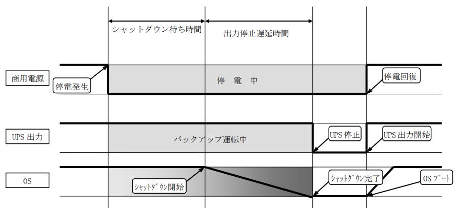 ・電源障害の継続、またはバッテリ電圧低下により OS シャットダウンを行います。