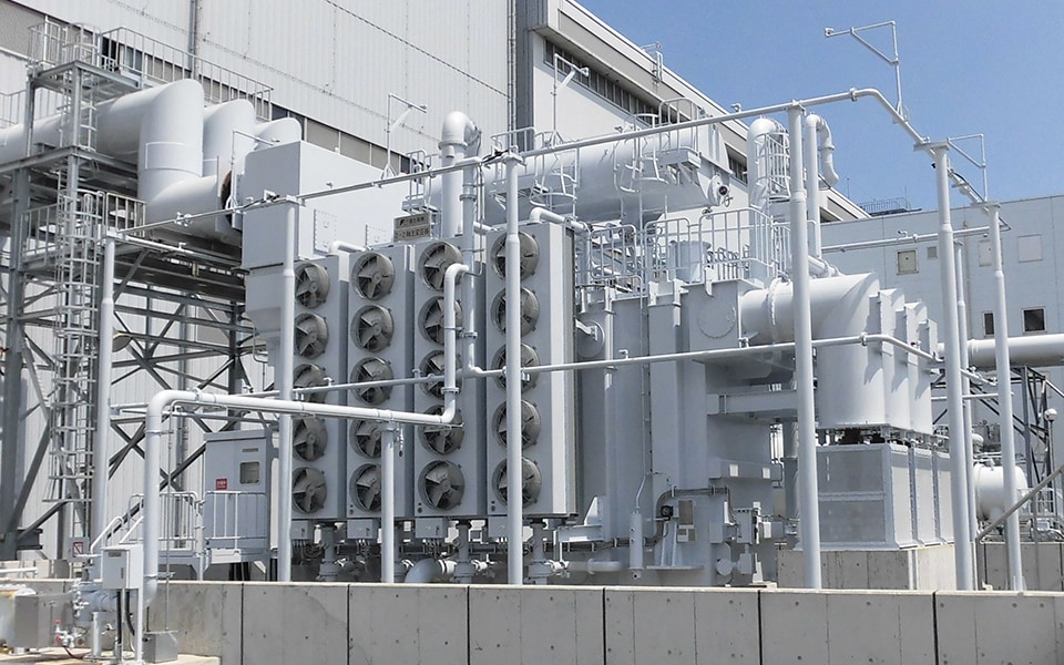 発電所用、送電用から都市部などのビル用まで。電力を最適に変圧する油入変圧器として、国内電力会社をはじめ各国の発電所にも豊富な納入実績を有しています。また、世界で初めて絶縁油にパームヤシ油脂肪酸エステルを採用するなど、環境・省エネにも配慮した多彩な油入変圧器を提供しています。