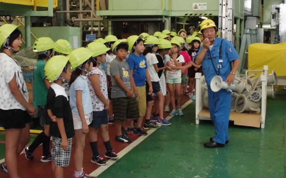 例年、近隣の小学生を工場見学へ招待し、近隣地域とのコミュニケーションを大切にしています。また、環境に配慮した製品の紹介なども行い、CSR活動のひとつとしても積極的に取り組んでいます。普段目にすることのない大型設備を見学できる機会として好評をいただいており、継続して行っている活動のひとつです。