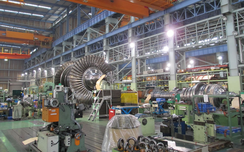 川崎工場では、昭和34(1959)年に最初の蒸気タービンを製造してからこれまでの間に、総出力55,739MW/1,000台以上を超える火力(蒸気・地熱タービン)発電設備、水力発電設備を製作し、世界各国に納入しています。多様化するニーズに応えた設計された図面を素に、職人の洗練された技で一品一品寸分の狂いなく造り上げていく。自働化する工場が増える中、匠の世界が川崎工場にはあります。