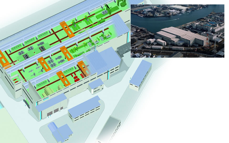 平成11(1999)年に操業を開始した白石工場は、各機種の製作時間短縮、物流合理化を担い、ワークセンター構想の基にレイアウトされた世界最新鋭のタービン・発電機一貫生産ラインを備えた専用工場です。また、工場から直接、海上輸送が可能な港も備えています。