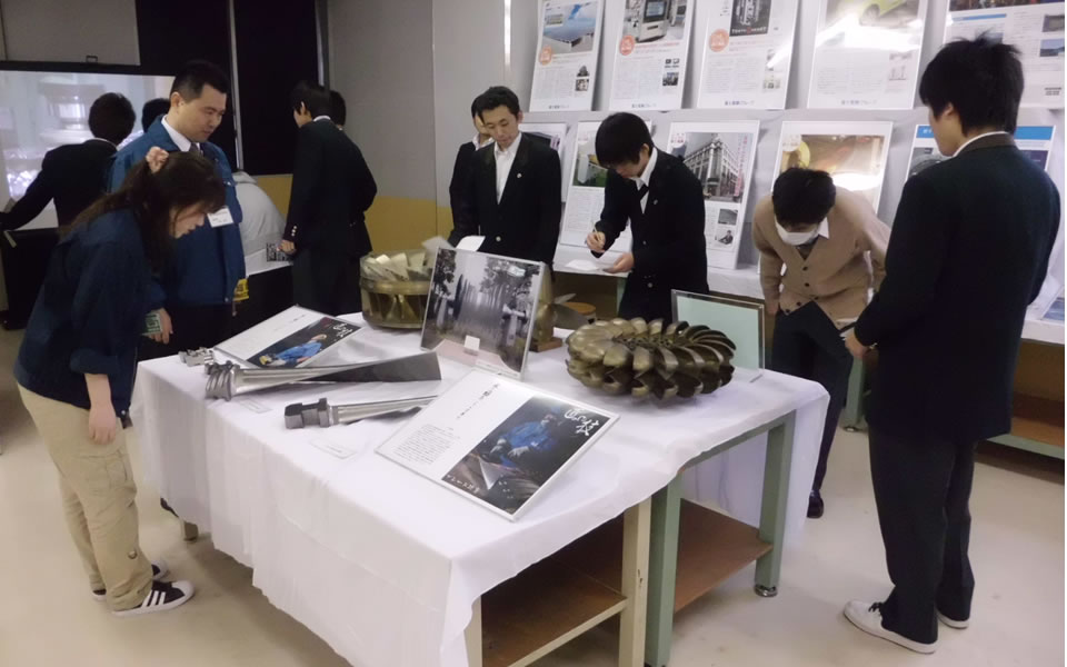 地元高校の文化祭に企業紹介ブースを出展することもあります。発電設備は普段なかなか接する機会がありませんが、私たちの生活に無くては困る電気であるだけに、多くの方に興味を持っていただきました。