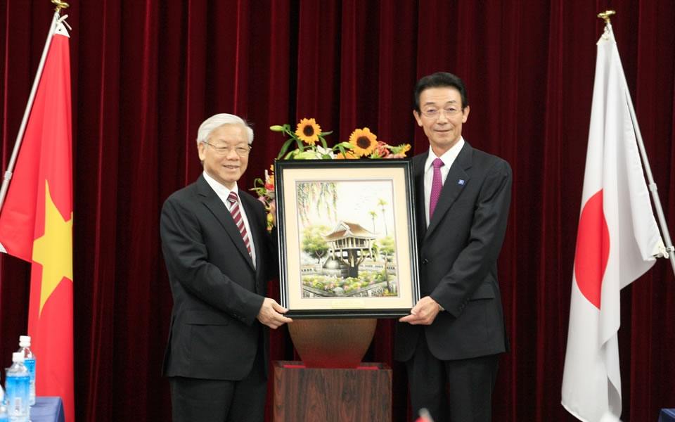 国の公賓が工場視察に来られることもあります。2015年度にはベトナム社会主義共和国のグエン・フー・チョン共産党中央執行委員会書記長が、安部総理との会談や天皇陛下御引見といった外交スケジュールに続き、企業訪問として川崎工場にお見えになりました。写真にある刺繍絵画はその際にベトナム社会主義共和国から頂いた記念品で、今も川崎工場に展示しています。