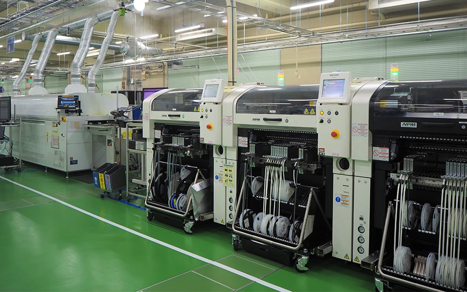 樹脂基板やシリコン基板への部品実装においては、超高密度実装技術により最終製品の小型化に貢献しています。東京工場では、最新の自動実装ラインが4ラインあり、月産約20万枚のプリント板を実装しております。