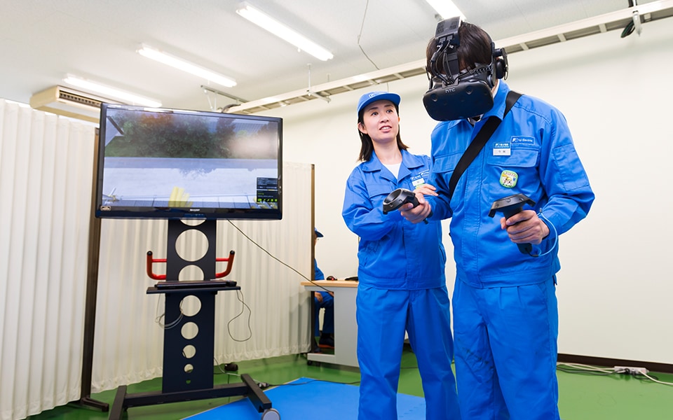 フィールド技術研修所では、現場作業を想定したプラント設備を用いて教育を行うことで、早期の技術力向上を目指しています。また、VR(仮想現実)を使った危険体感教育も実施しており、様々な事例を疑似体験することができます。