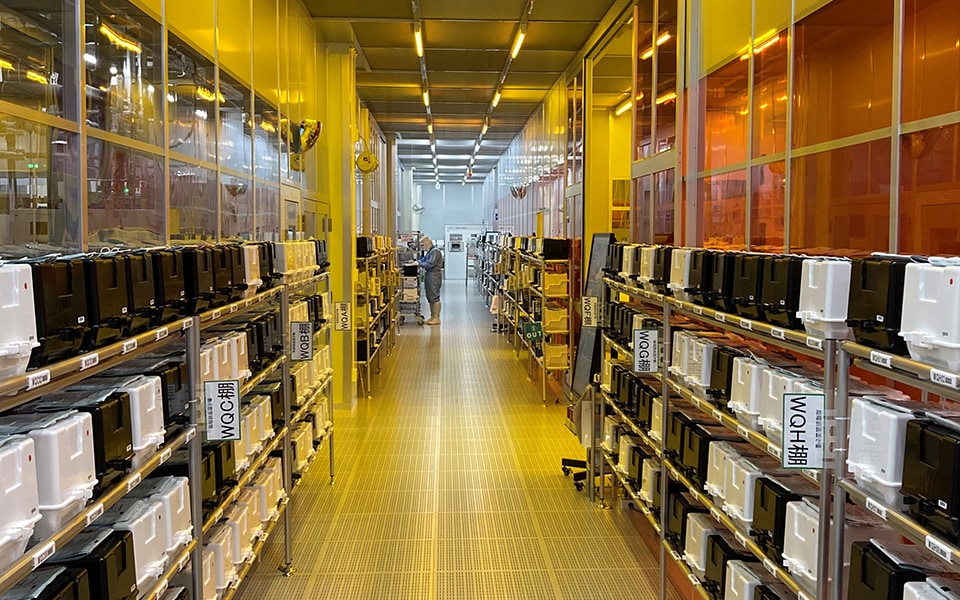 半導体の製造を行う山梨工場では、生産施設のほとんどがクリーンルーム(室内の汚染物質が所定の量<個数>以下に制御されている空間)です。年々増していく半導体の微細化要求にも十分に応えられる環境のもと、高性能かつ高機能な製品を生み出しています。