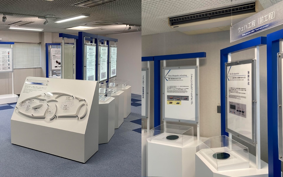 ショールームでは、本物の8インチウェハとともに半導体の製造工程を紹介。また実際にパワー半導体が搭載されている製品も、その役割を説明しているパネルとともに展示しており、パワー半導体をより身近に感じてもらえる空間となっています。