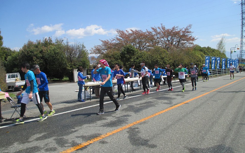 山梨工場は全国各地から7000人以上のマラソン愛好家が集まる「南アルプス桃源郷マラソン大会」に協賛しています。選手としての参加はもちろん、給水所の設置などボランティアとしても貢献。この南アルプス市の一大イベントを通じて、従業員どうしに留まらず地域の方々との交流も深めています。