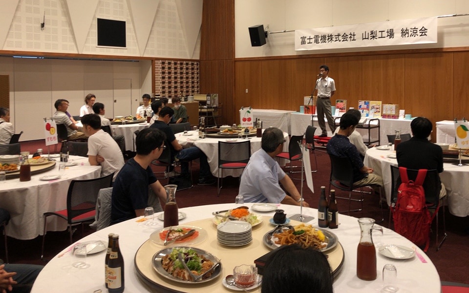 納涼会には毎年、多くの従業員が参加しています。山梨工場は24時間操業のため、勤務体制に配慮し2日に分けて実施。従業員どうし先輩後輩の垣根を超えて親睦を深められるよう、ゲームや抽選会など多彩な催しを企画して大いに盛り上げます!!