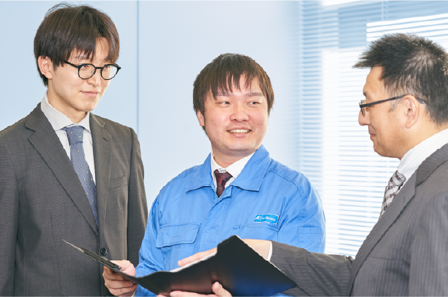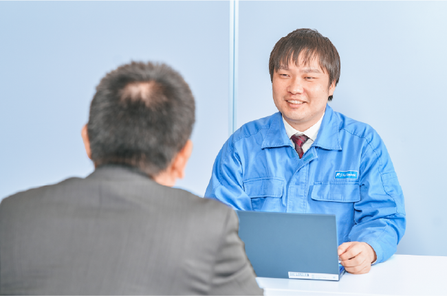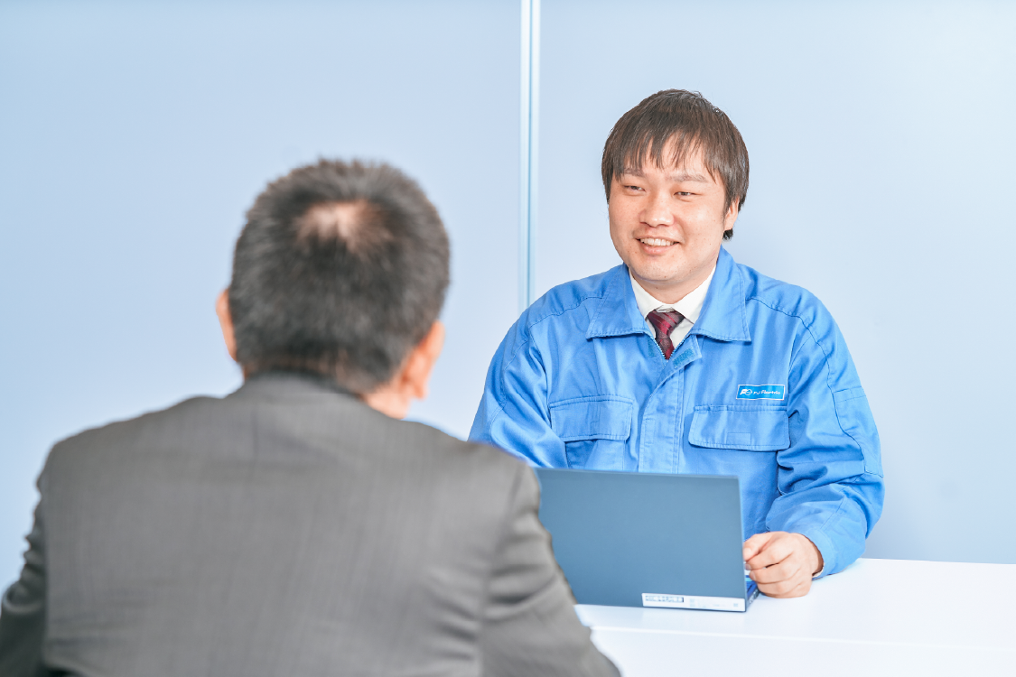 仕事は設備の規模に合わせて、3人から10人のチームで対応します。担当エリアは関東圏全域。訪ねる現場もさまざまです。私はチームリーダーとして、お客様との交渉や費用見積、また新しい設備の提案なども行っています。