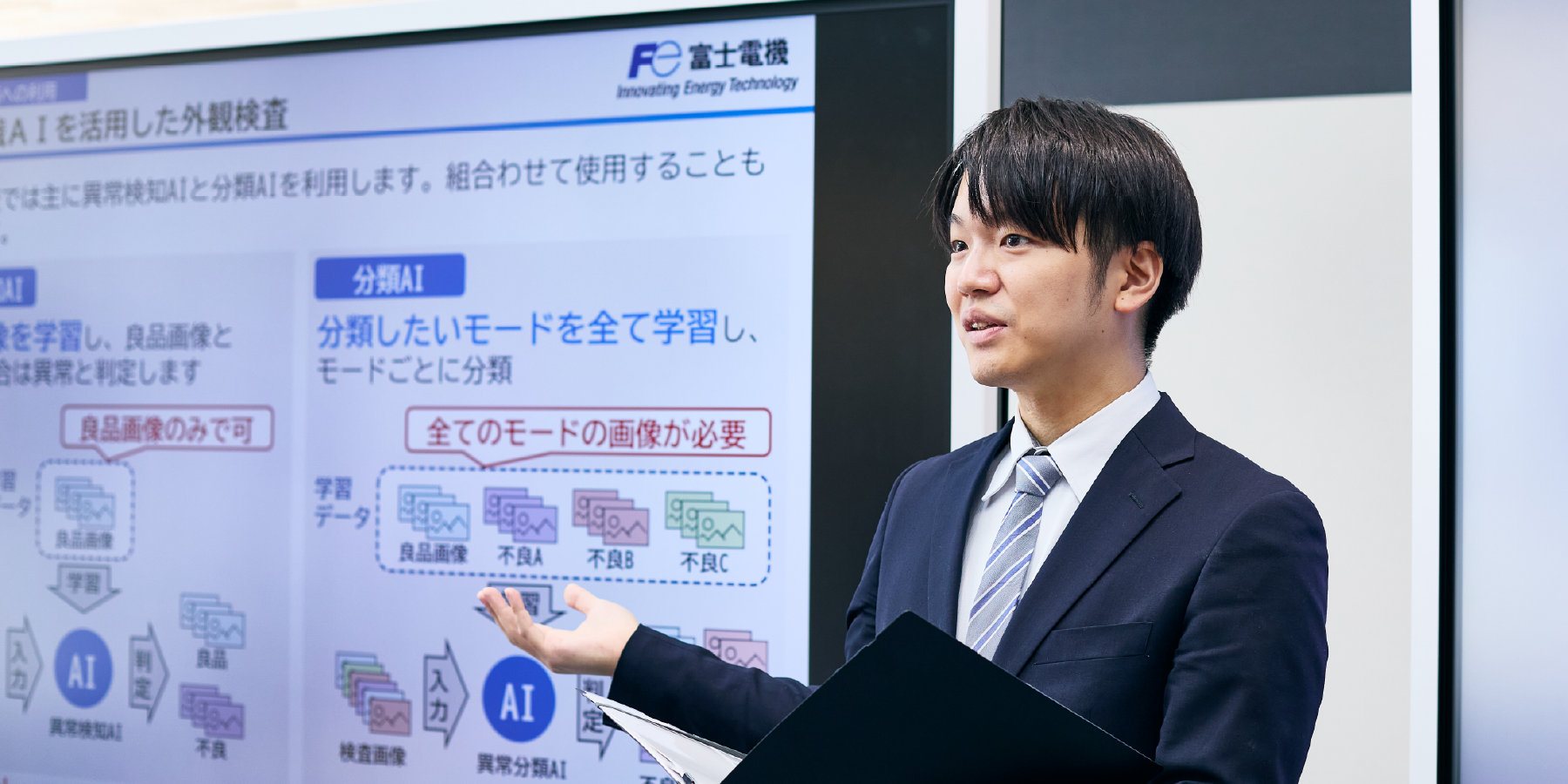 私の業務の一つは、「外観検査」の自動化に向けたAIによる画像認識技術の研究開発です。例えば、これまで人の目で行っていた半導体の製造過程での不良判定を、AIで代替・自動化することを目指しています。それだけではなく、研究成果を不良品の分析や製品評価のプログラム開発に活用し、製造ラインの生産性向上や製品性能の引き上げなど重要なミッションもあります。